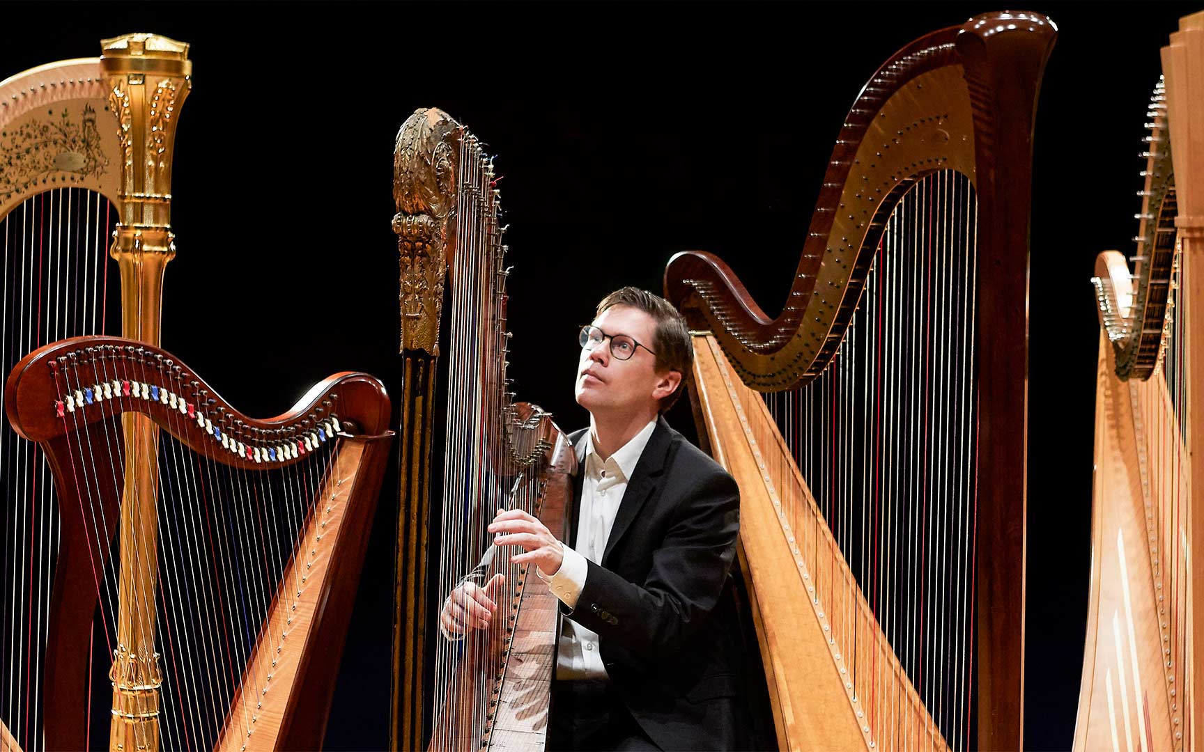 Harpisten Erik Goenstein-Hendriks har ni tidigare sett i våra nyårskonserter. Denna gång får han stå i centrum i ett program byggt kring hans instrument. Inspirerade av Ravels Introduktion och Allegro, där harpan spelar huvudrollen, presenteras kammarmusik där även flöjt och klarinett får glänsa. Mozarts eleganta flöjtkvartett inleder programmet följt av Caplets dramatiska tolkning av Poes Röda dödens mask. Därefter Crusells lyriska Klarinettkvartett varpå Francaix bjuder på en charmig kvintett för flöjt, stråkar och harpa. Konserten kulminerar med Ravels ikoniska verk där harpan visar upp sitt dynamiska omfång.